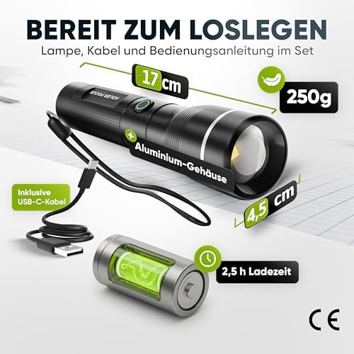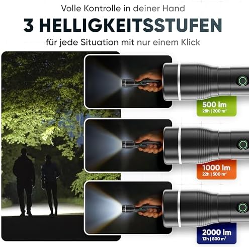 Hochwertige LED Taschenlampe 2000 Lumen | Fokussierbarkeit 800m | 28h Akku | Ideal für Camping und Wandern