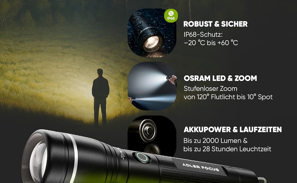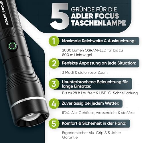 Mit einer Leistung von 2000 Lumen verwandelt die Adler Focus Taschenlampe die Nacht in Tag. Ihr durchdachtes Design und die ergonomische Form sorgen für ein angenehmes Handhabungserlebnis, sodass Sie sie mühelos über längere Zeiträume verwenden können. Machen Sie sich bereit, alles im Blick zu behalten!