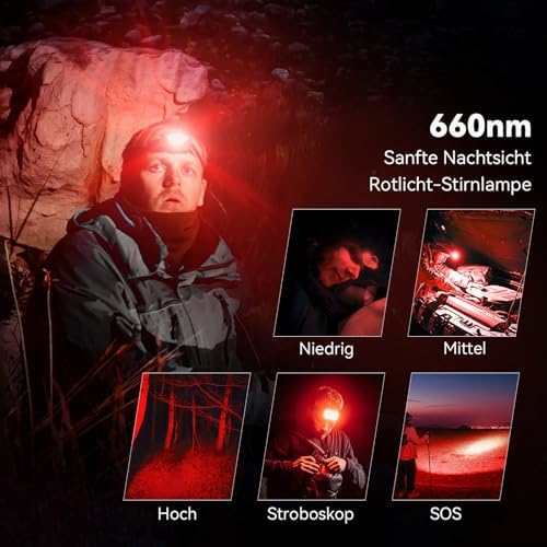 Mit 15 unterschiedlichen Modi, die Weißlicht, Rotlicht und Stroboskopfunktionen umfassen, bietet die Stirnlampe maximale Flexibilität für verschiedenste Anwendungen. Die intuitive Bedienung ermöglicht ein schnelles Umschalten zwischen den Modi – ideal für Notfälle, Outdoor-Abenteuer oder den täglichen Gebrauch.