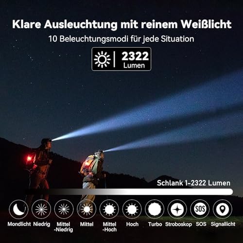 Unsere Stirnlampe vereint zwei wesentliche Lichtquellen: das sanfte Rotlicht, ideal für Aktivitäten wie Nachtsicht beim Jagen und Angeln, sowie das leistungsstarke Weißlicht, welches sich perfekt für Arbeiten, Radfahren oder Joggen eignet. Mit einer beeindruckenden maximalen Helligkeit von 2322 Lumen erfüllt diese Lampe alle Lichtbedürfnisse sowohl bei Tag als auch bei Nacht.