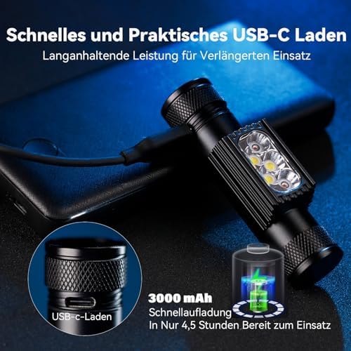 Mit einem versteckten USB-C-Ladeanschluss ausgestattet, lässt sich die Stirnlampe in nur 4,5 Stunden vollständig aufladen. Der wiederaufladbare Akku garantiert eine lange Betriebszeit, wodurch diese Lampe zur idealen Wahl für den täglichen Gebrauch und aufregende Outdoor-Aktivitäten wird.